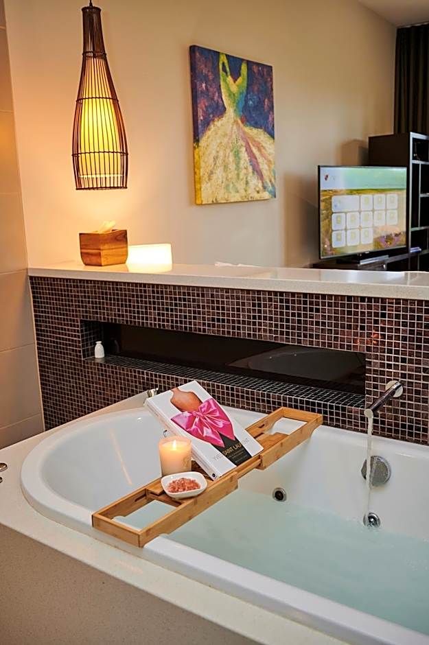Located in the adults-only wing of the hotel, the Spa Suite features easy access to the resort's spa, with a private bridge. The suite features and king-sized bed with duck down pillows. plush towels and robes. Guests can relax in the spa bath or enjoy a shower. Complimentary toiletries are included. The suite features a 42-inch LCD HDTV. Enjoy the use of Nespresso coffee machine or tea making facilities. Enjoy the seclusion and privacy of an enclosed courtyard.