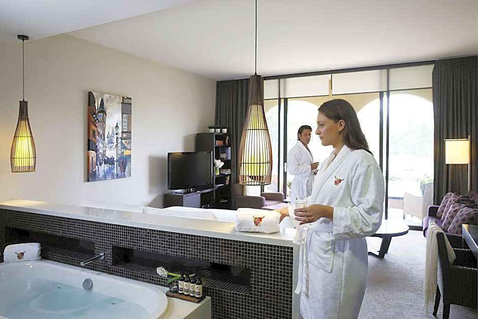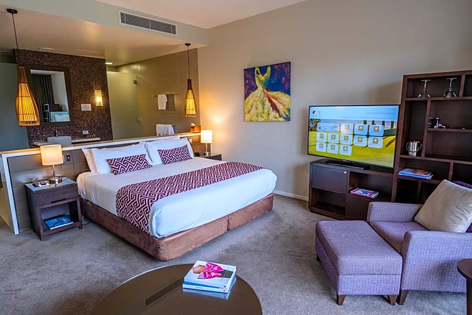 Located in the adults-only wing of the hotel, the Spa Suite features easy access to the resort's spa, with a private bridge. The suite features and king-sized bed with duck down pillows. plush towels and robes. Guests can relax in the spa bath or enjoy a shower. Complimentary toiletries are included. The suite features a 42-inch LCD HDTV. Enjoy the use of Nespresso coffee machine or tea making facilities. There is a private balcony with views of the Hunter Valley.